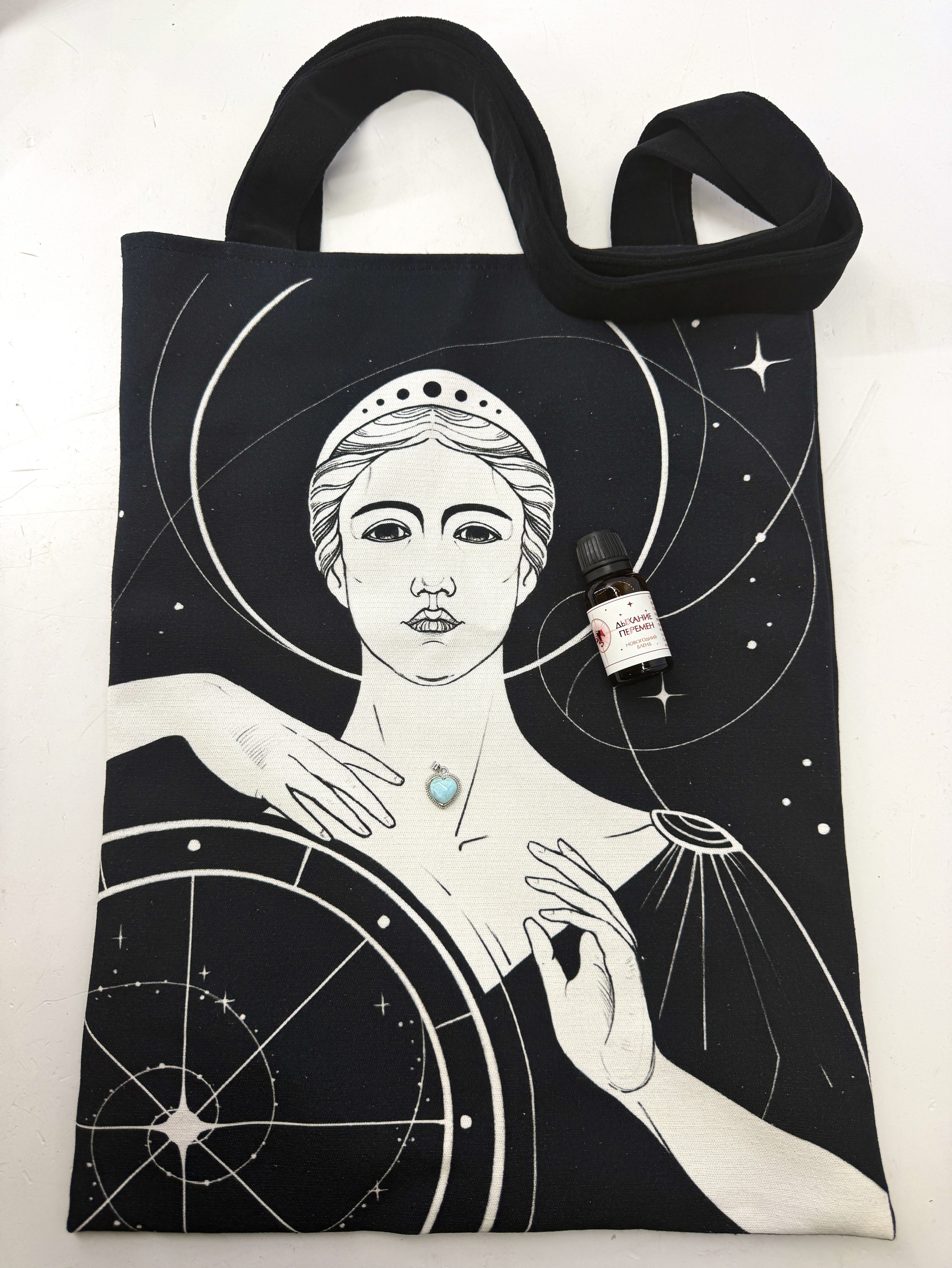1. Шоппер "Богиня Фортуна" - напоминание о постоянном движении судьбы, умении отпускать контроль. А удача любит тех, кто умеет идти дальше и видит возможности там, где раньше был лишь страх.